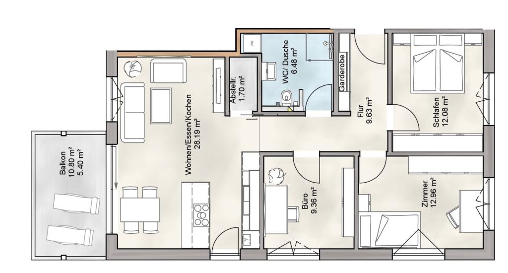 Die Wohnung Nr. 4 im 1. Obergeschoss verfügt über einen sehr ansprechenden Grundriss: Helles Wohn- und Esszimmer mit offener Küche. (Der Mieter bringt seine Küche mit!) Komfortable Hebe-Schiebetüre zum großen sonnigen und überdachten Balkon Richtung Süd-West. Sehr praktischer Abstellraum neben der Küche.