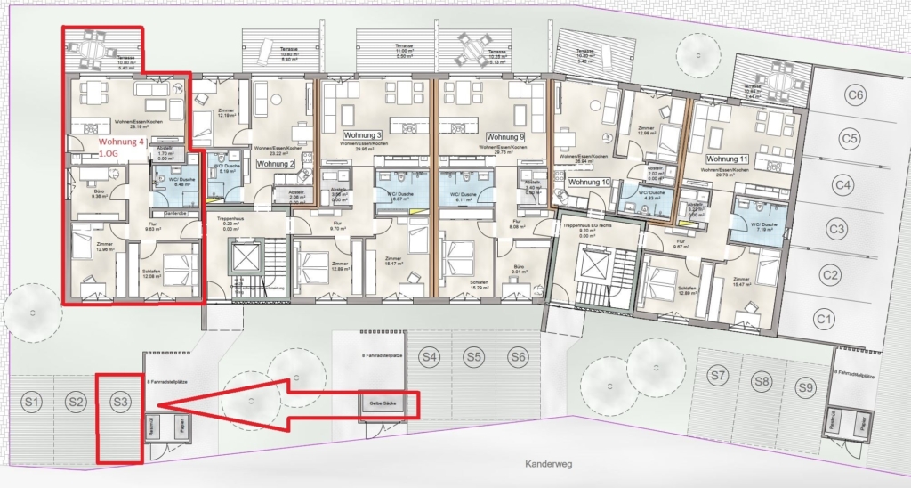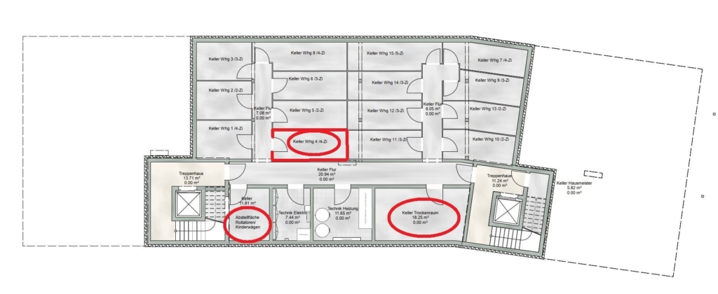 Zur Wohnung gehören ein Kellerraum sowie ein Stellplatz vor dem Haus, der mit einer Wallbox für die Ladung eines E-Autos zur Verfügung steht. Ebenso gibt es abschließbare Häuschen zum Abstellen der Fahrräder.